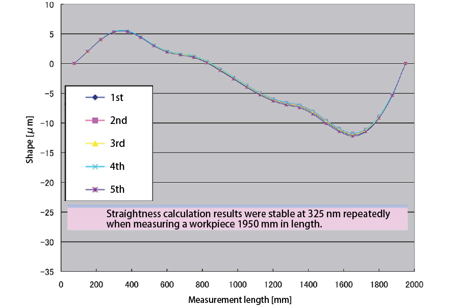 - Measuring accuracy is 0.33μm/1m. 2m or larger workpieces can be measured for straightness with high repeatability and reproducibility.