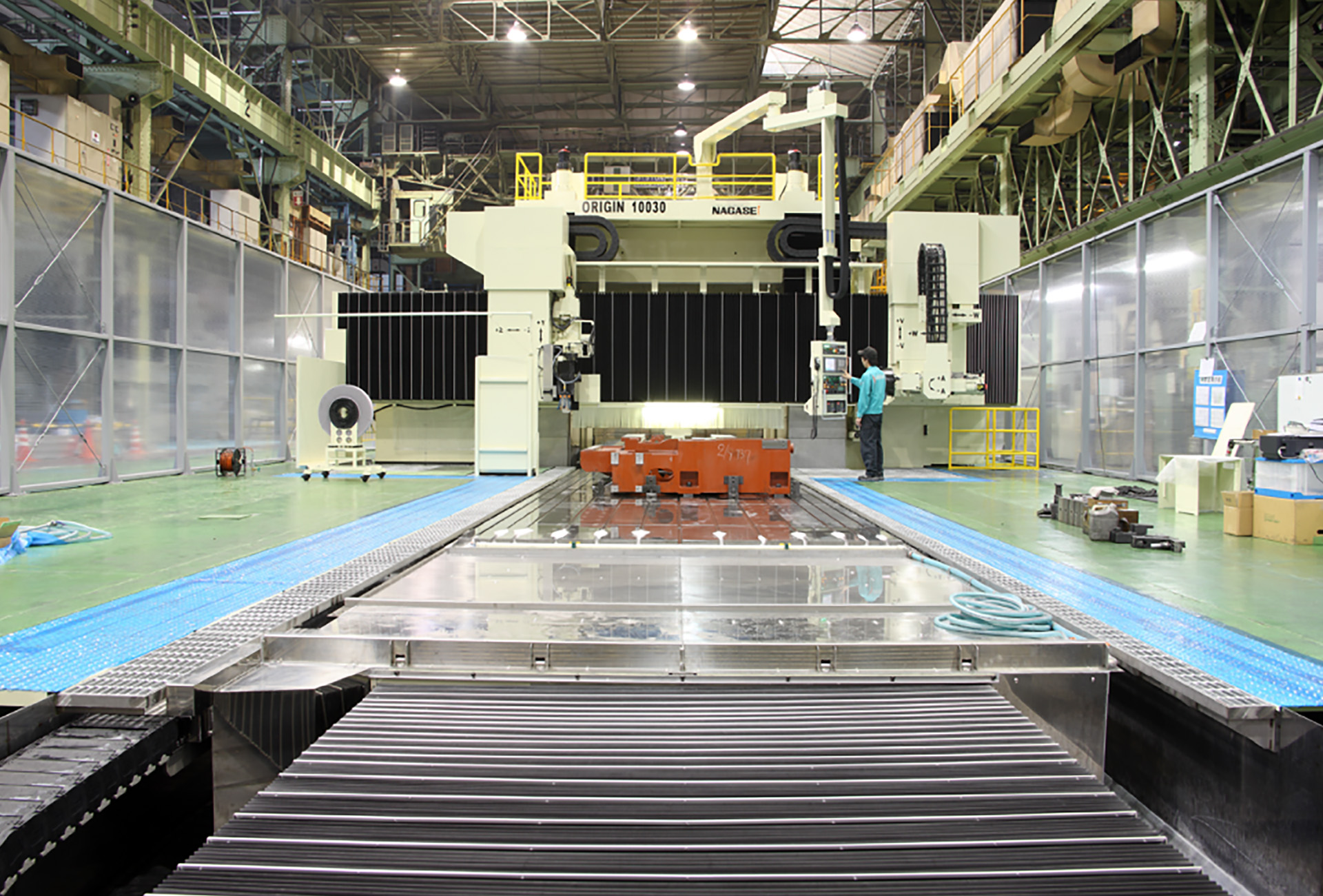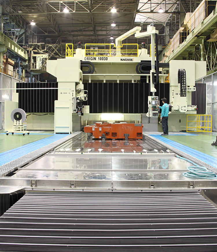 Development of an ultra-large rotary table of ⌀2700 (rotation accuracy: 0.2μm in axial direction, 0.5μm in radial direction), rotary grinding and ID grinding of large-diameter workpieces are possible with unprecedented accuracy. The high-precision automatic pallet changer also allows automatic machining, even during the night. In addition, various units and devices for improving productivity in large-workpiece machining have been developed.